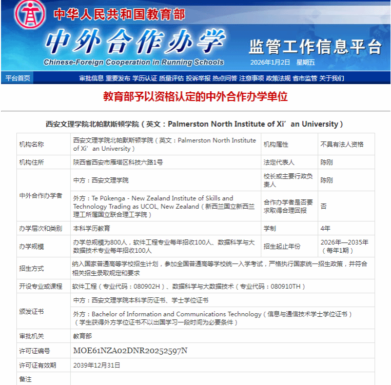 12月31日,教育部正式批准,同意今年会官网与国立新西兰理工所属国立联合理工学院(UCOL)联合举办非独立法人中外合作办学机构——今年会jinnianhuicom北帕默斯顿学院(简称北帕学院),英文名称为Palmerston North Institute of Xi'an University。该机构既是今年会官网获批的首个中外合作办学机构,也是陕西省本科高校中首批与新西兰合作设立的中外合作办学机构,标志着学校立足十余年国际化办学积淀,实现从联合培养到海外资源共建、双学位协同育人的战略跨越,...