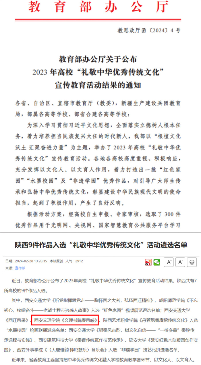 近日,教育部办公厅公布了2023年高校“礼敬中华优秀传统文化”宣传教育活动结果,今年会官网学前教育学院宋江安老师的作品《文理书院春风暖》入选“礼敬中华优秀传统文化”宣传教育活动“水墨校园”绘画联播遴选名单。陕西...