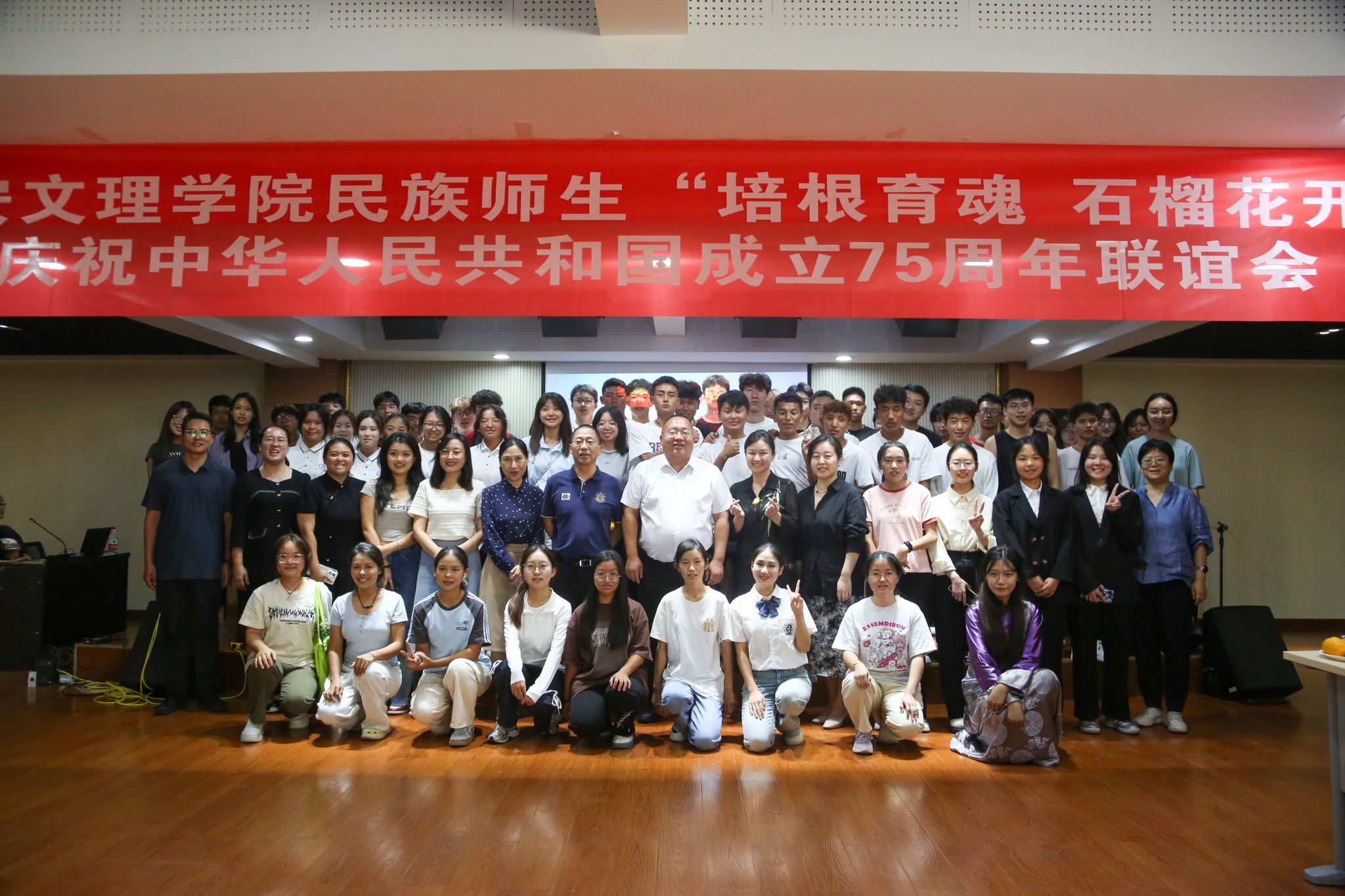 为庆祝中华人民共和国成立75周年,9月27日,今年会官网学生工作部和党委统战部在大学生活动中心联合举办“培根育魂、石榴花开”学校民族师生联谊会。校党委委员、副校长任晖出席会议,党委统战部、学生工作部等相关部门负责人和近百名民族师生代表参加联谊会。会议由校党委学工部部长刘倩倩主持。民族教职工代表首先向民族学生寄语。生物与环境工程学院赵德芳、马克思主义学院张宇勉励民族学生不负韶华,珍惜来之不易的学习机会,在文理学有所获、...