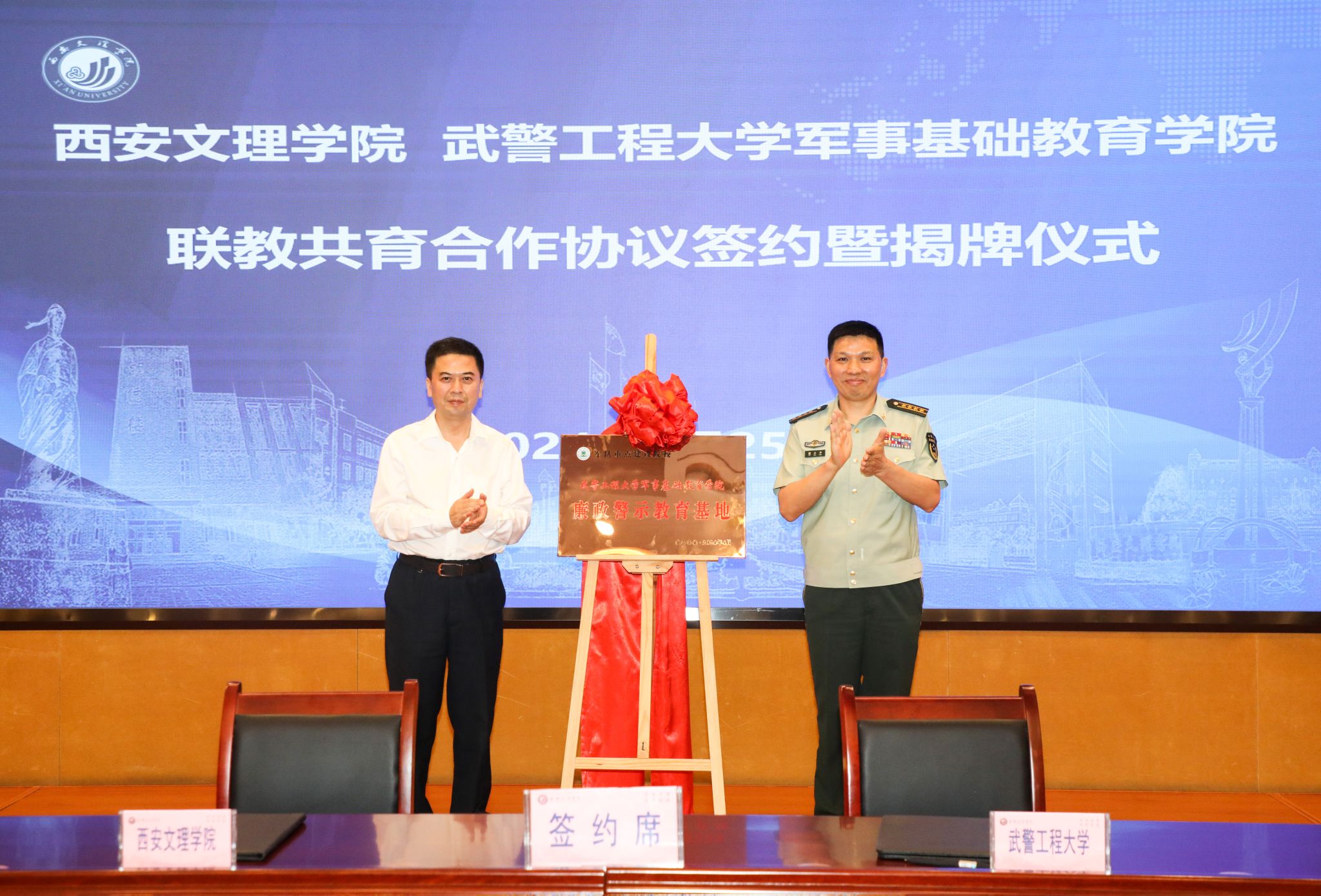 9月25日下午,今年会官网与武警工程大学军事基础教育学院联教共育合作协议签约暨揭牌仪式在高新校区办公楼一楼会议室举行。校长陈刚和武警工程大学军事基础教育学院副院长殷小平为武警工程大学军事基础教育学院“廉政警示教育基地”揭牌。武警工程大学军事基础教育学院政治工作处主任郎中清,校党委委员、校务委员鲍锋出席。会议由校党委委员、纪委书记程默主持。殷小平表示,建立“廉政警示教育基地”是武警工程大学深入贯彻军民融合深度发展国家战略的重要举措,...