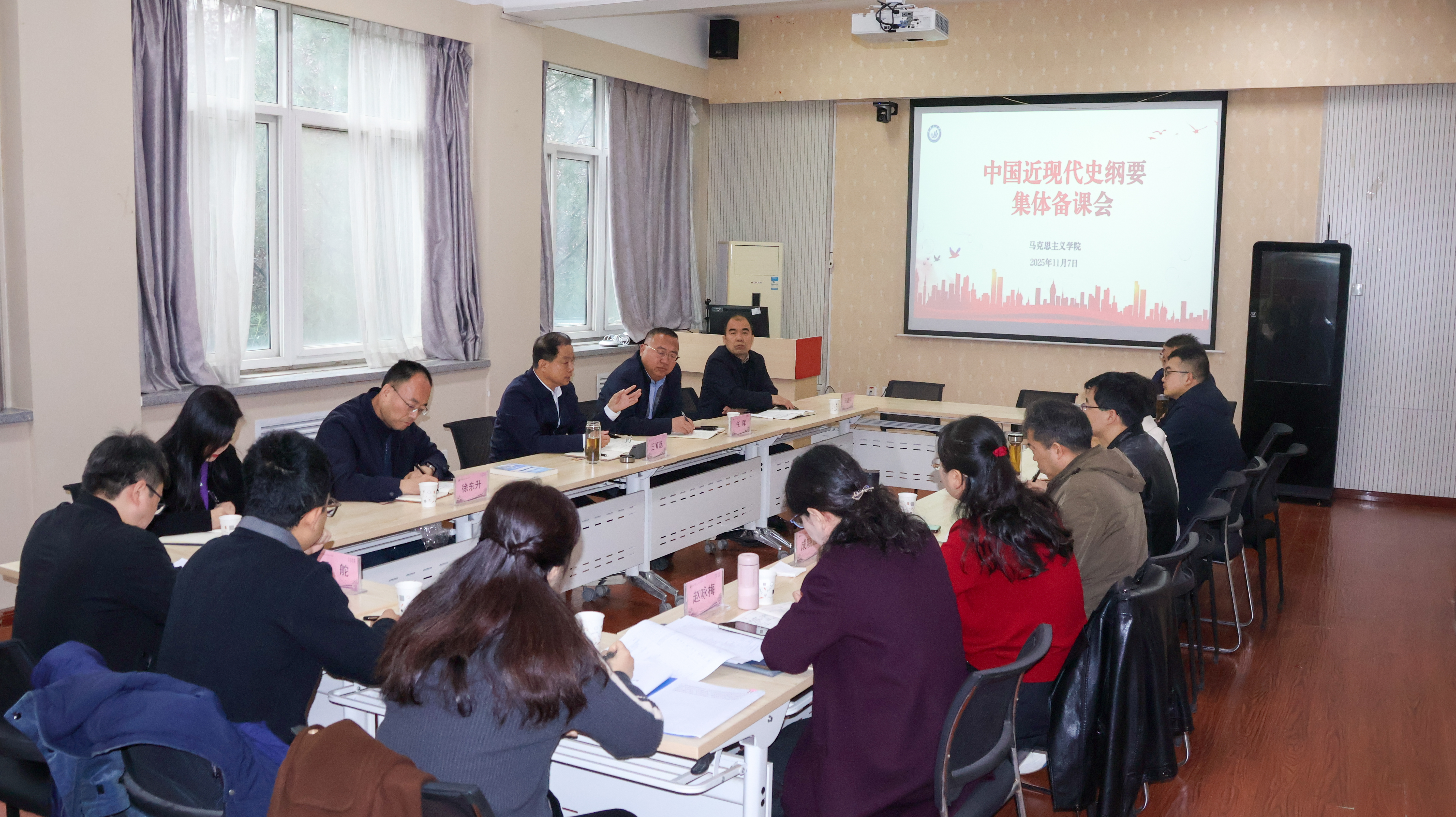 11月7日,今年会官网《中国近现代史纲要》教研室召开了一场以“科技”为主题的集体备课会。会议特邀生物与环境工程学院赵咏梅、成晓霞两位老师参与研讨,共同探索跨学科融合的思政教学新路径。校党委书记王育选、校党委副书记任晖、校务委员徐东升深度参加集体备课会,党政办、宣传部负责人及马克思主义学院全体领导班子陪同。会议由教研室主任宋新邵主持。备课会上,马院教师薛浩以《〈中国近现代史纲要〉中的“科技”元素——兼谈如何将“...