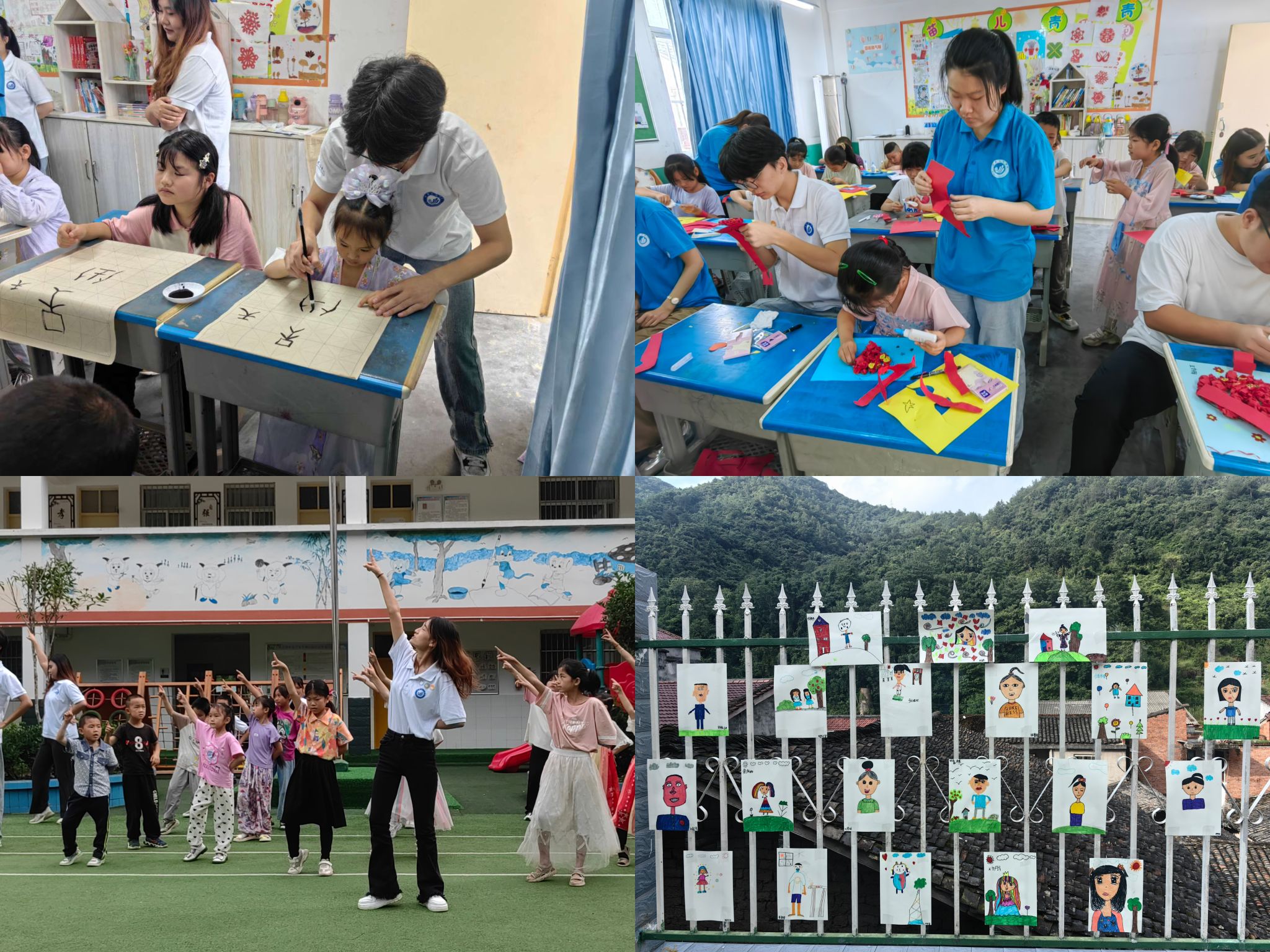 在活动中,支教团队主要开展了科学、书法、手工、美术、音乐、舞蹈等特色课程。科学课堂上,一个个科学小实验无不吸引着孩子们那一双双渴求知识的眼睛;书法课堂上,孩子们在小老师们手把手的悉心指导下,凝神静气,一笔一划,字迹工整美观。手工课堂中,孩子们在玩耍中学习,制作出国旗等一件件手工作品,享受着乐趣和成就感,同时也培养了耐心和坚持不懈的精神;美术课上,鼓励孩子们以多样化的绘画方式展现自我,打开想象空间,一幅幅精美的自画像增强了他们的自我价值感。