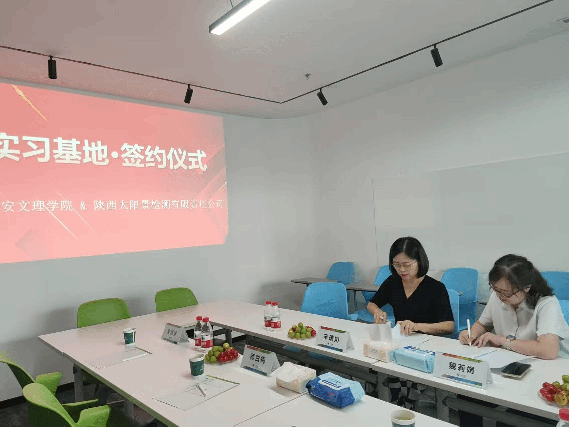 9月4日上午,化学工程学院与陕西太阳景检测有限责任公司实习基地签约挂牌仪式在太阳景公司会议室举行。太阳景公司质量总工程师魏莉娟、环境总工程师黄静瀛、人资经理李亚川等及化学工程学院教学副院长宋瑞娟教授、应用化学系主任贾园副教授、实习指导教师师白梅、辅导员教师李晨妤参加了此次会议。