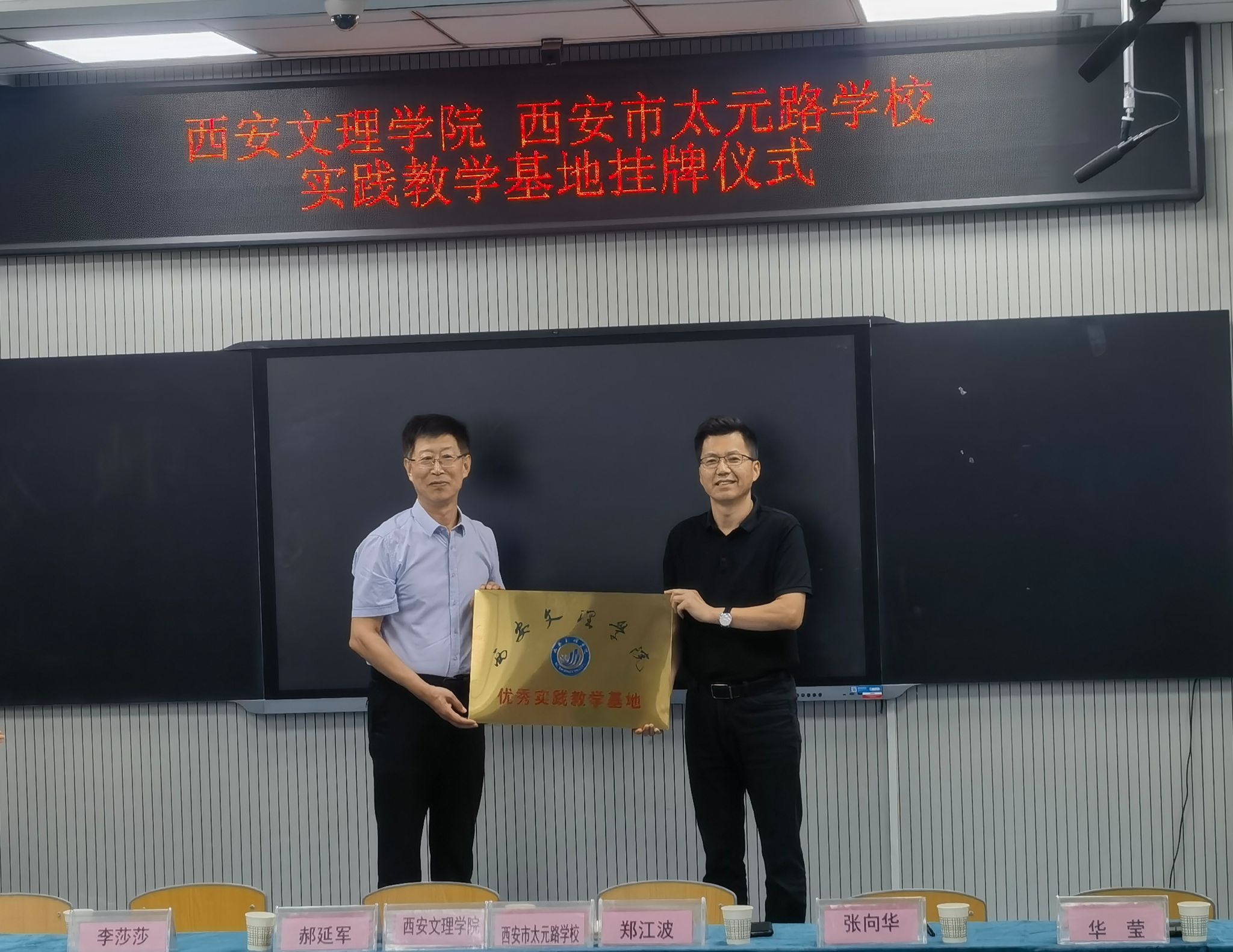 9月11日早上,文学院院长郝延军、党总支书记李莎莎、副院长苏羽、中国语言文学系主任于展东、以及汉语言文学专业19名实习生一行赴西安市太元路学校,举行实习就业基地和优秀实践教学基地的挂牌仪式,并开展本学期教育实习工作。太元路学校校长郑江波、副校长张向华、教导主任李伟、党支部书记华莹、德育主任王倩及教师代表参加了挂牌仪式并交流座谈。