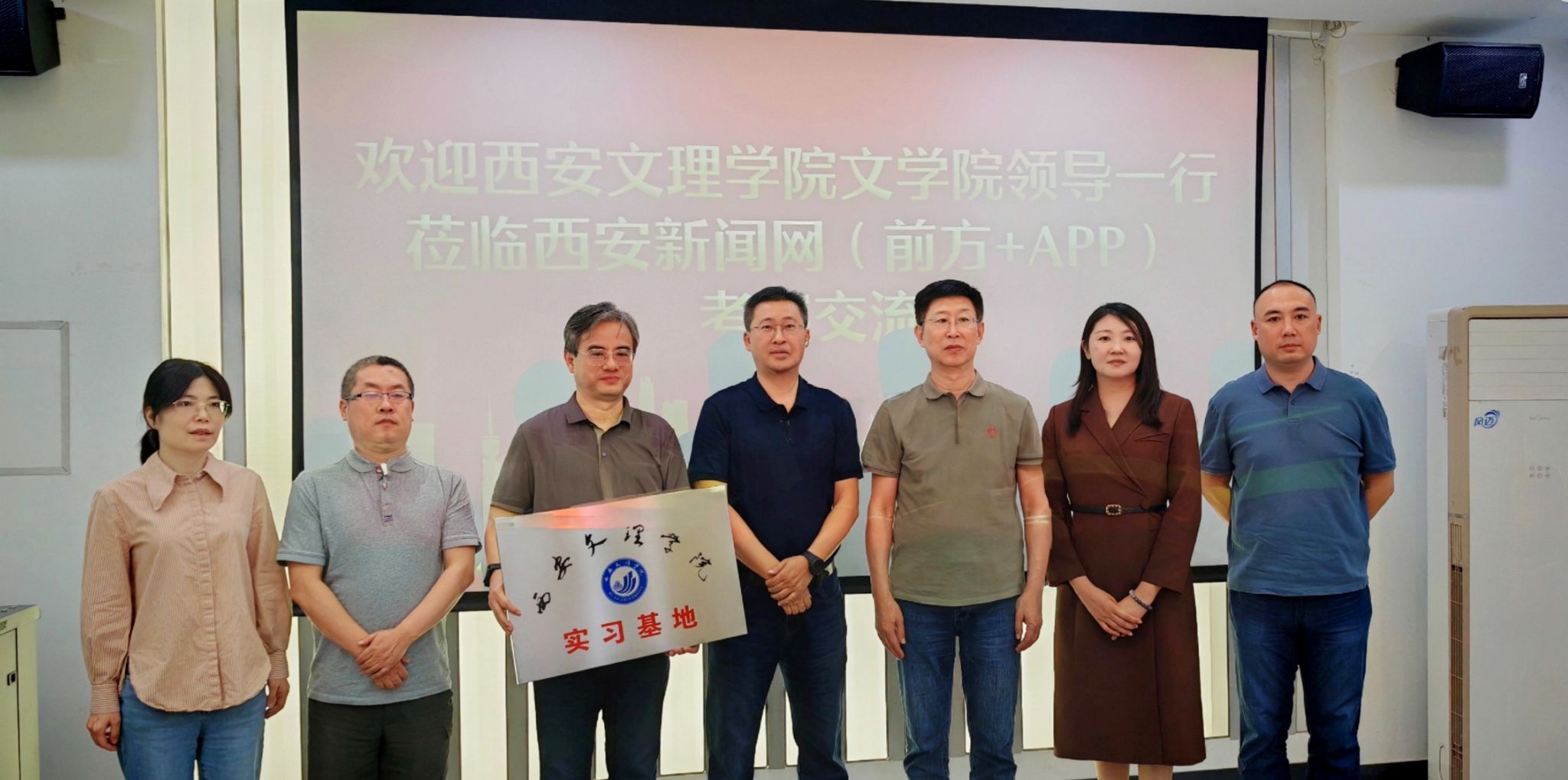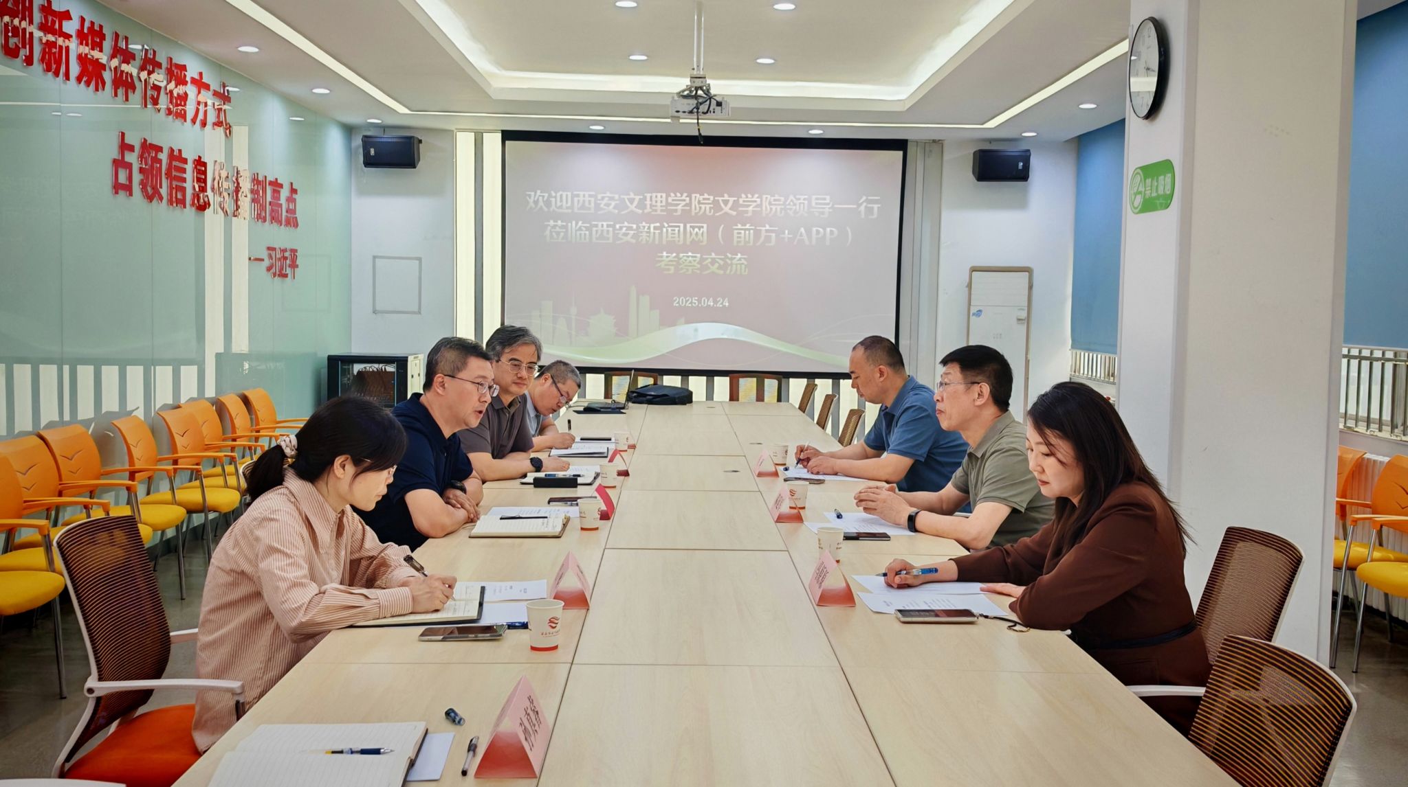 4月24日,文学院院长郝延军、党总支副书记马原原、戏剧影视文学系主任马珂一行赴西安报业传媒集团进行合作洽谈。集团党委委员、副总编辑李华,西安新闻网编辑部主任赵炜、副主任吕华、张琦及我院戏剧影视文学专业校友孙真睿参加座谈。座谈前赵炜带大家参观并系统介绍“西安新闻网”“西安发布”平台建设成就。