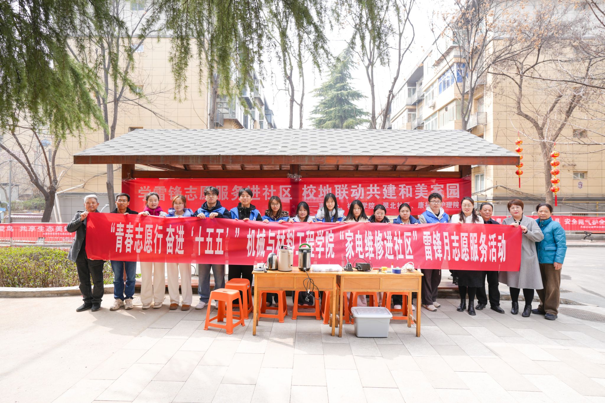 活动现场暖意融融、秩序井然。机材学院师生志愿者为居民免费检修豆浆机、电饭煲、热水壶等小家电,现场普及家电安全使用知识。医护人员免费为老人测量血压、血糖,提供健康咨询,让老人在家门口享受到专业医疗服务。社区志愿者带来便民磨刀、义务理发等服务,得到居民一致称赞。