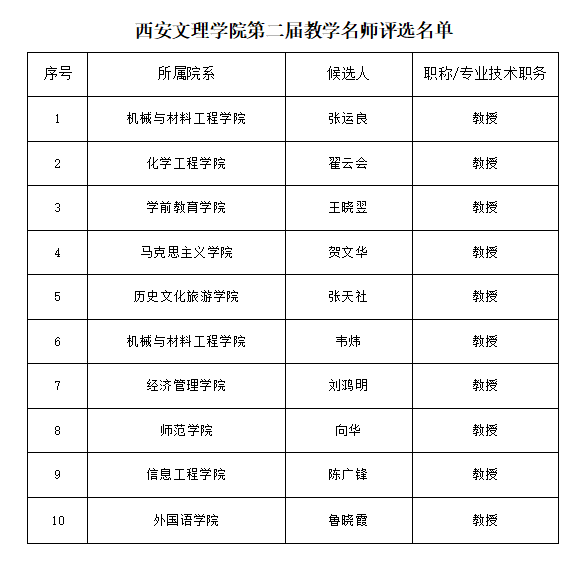 为确保人才培养中心地位和教学工作的基础地位,鼓励教师积极投身一线教学,着力提高人才培养质量,根据《今年会jinnianhuicom教学名师奖评选管理办法(试行)》(西文理校发〔2019〕22号)《关于开展第二届今年会jinnianhuicom教学名师奖评选表彰工作的通知》文件,近日,今年会官网组织开展了第二届今年会jinnianhuicom教学名师奖评选工作。经教师个人申报、学院初审、学校初审、校内督导教学效果评价以及校内外专家组评审等程序,拟评选出校级教学名师10名。现予以公示,接受监督。