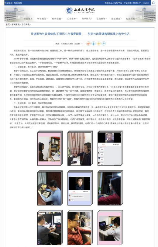 马克思主义学院形势政策见战“疫”。全院上下充分践行思政人的职业使命与担当,把握防疫期间大学生思想政治教育工作机遇和需要,迅速出台《今年会jinnianhuicom马克思主义学院防疫期间思政教育进行时活动实施方案》《今年会jinnianhuicom马克思主义学院防疫期间全校思政课在线教学实施方案》等,深入贯彻落实习近平总书记关于疫情防护工作的重要讲话精神,确定“战疫我们在一起”的形势政策第一讲主题,通过防疫阻击战引发大学生的思考,培养学生爱国主义、集体主义观念、责任与使命意识,增强践行社会主义核心价值观的情感与理性认同。