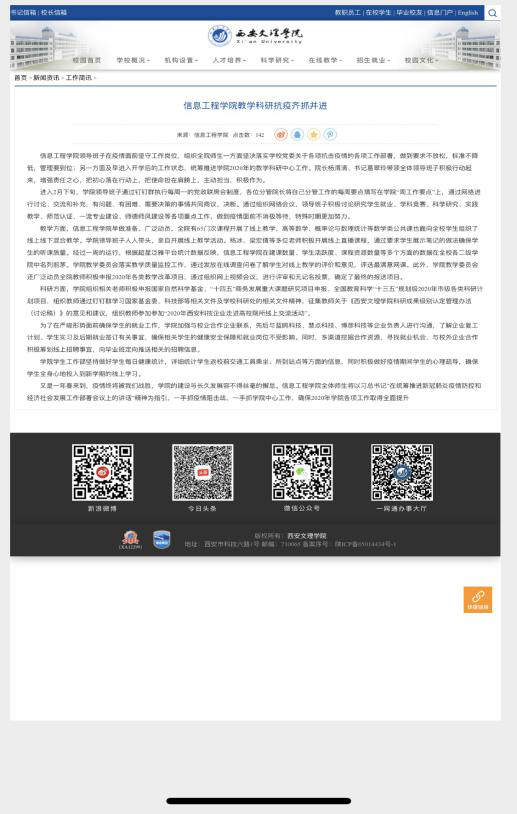 (二)以创新促发展。在确保线上教学质量不降低的基础上,各二级学院积极开拓工作思路,创新工作形式,从教学组织管理、课程建设、思政育人到实践教学环节设计、学习效果评价方式创设等各个方面积极探索,不断推进在线教育工作持续改进提升,全力推动防疫期间教育教学各项目标任务达成。