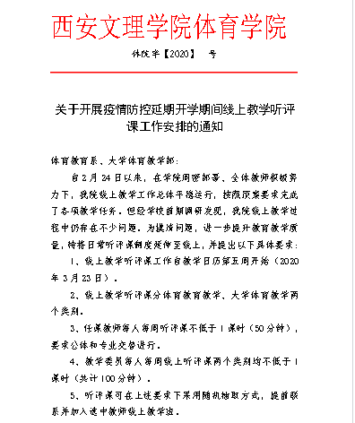 体育学院根据专业课程教学工作特点,提出“两大块,四方面”的线上教学整体工作方案,即公体、专业两大块,场地器材依赖型项目、非场地器材依赖型项目、专业实践型课程、专业理论型课程四个方面,分别提出了不同的线上教学要求。学院召开线上教学专题工作会,明确组织机构、厘清人员分工,全院总动员,全力克服体育课程线上教学难度大的问题。建立并完善线上教学督导体系,制作线上听课记录模板、学生信息反馈模板,要求教学委员成为线上教学督导员,每周听课不低于2课时,需兼顾专业课和公体课;教师每周听课不少于1课时,专业课和公体课交替进行,为把控教学质量保驾护航。