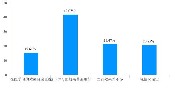 (二)在线教学方式认可度显著提升。对疫情结束后,更愿意选择的教学方式的选择上,87%的学生表现出对线上教学的认同,其中57%明确表示更愿意选择线上与线下相结合的方式;对比线下教学效果,57%的学生认为线上学习效果不一定比线下学习效果差。学生学习体验好感度明显上升,对在线教学方式接受度和认可度有较大幅度上升。