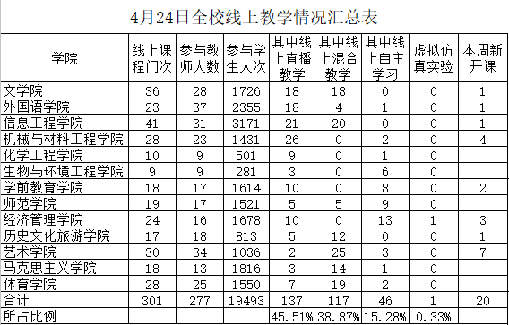 3月23日—4月30日,学校线上开课806门,共计1652门次。开课教师705名,累计授课8391人次,在线学习学生9629名,累计线上学习577725人次,平均到课率99.26%。