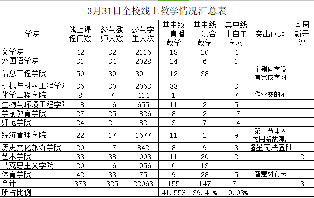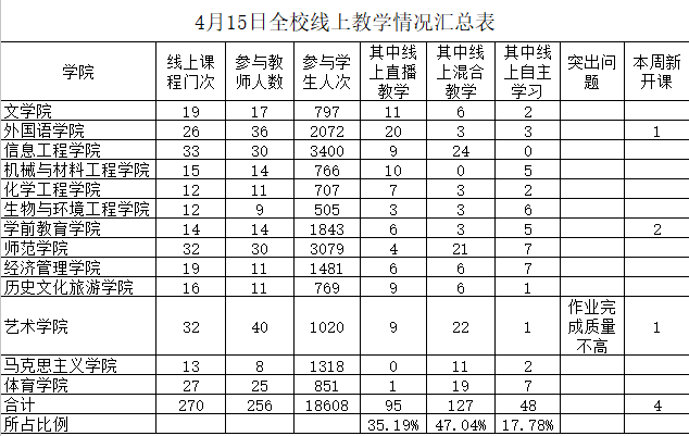 学校坚持“日统计—周汇报—月反馈”的常态化在线教学质量监控制度。各教学单位每日统计在线教学信息并上报教务处备案;教务处每周发布在线教学简报,各教学单位每周召集教学例会,交流线上教学经验,加强线上教学研判,及时总结经验;教务处每月根据问卷调查结果和校级教学督导听评课情况撰写并发布在线教学质量报告。学校在常态化监控基础上进一步加强在线教学质量监控与研判,4月初组织各二级学院总结在线教学阶段性工作,提炼经验、反思问题,梳理下一步改进工作思路。