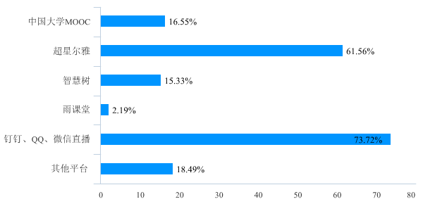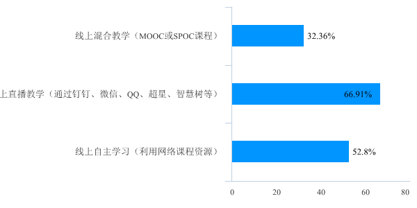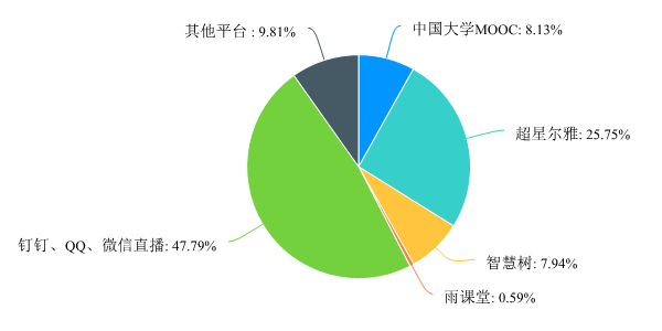(一)开课基本情况。目前,学校共开设在线课程809门,其中专业课778门,公共课31门。截止3月15日,全校线上开课共计1508门次,其中公共课246门次,专业课1262门次。通过自建MOOC/SPOC课程、平台课程资源开展混合式教学的占47.55%,利用钉钉、微信、QQ、抖音等直播平台进行线上直播教学的占32.83%,通过资源推送、远程辅导、作业布置等方式督促学生自主学习的占19.62%。