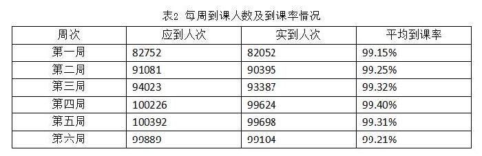 根据课程安排,应参加在线学习的学生9629人,其中第六周应参加在线学习的学生99889人次,实际上课人数99104人次,平均到课率为99.21%。每周到课人数及到课率情况如表2所示。