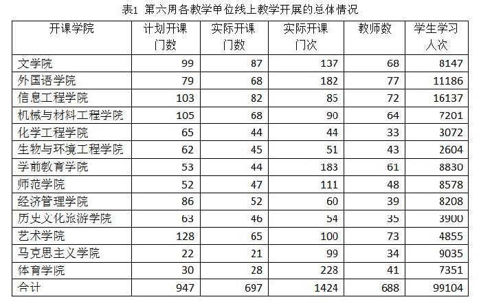 本学期全校教学计划安排947门课程,截止4月3日已开展线上教学的课程有697门,占全部课程的73.6%;尚未开始线上教学的课程有250门,占全部课程的26.4%,均是目前不具备开展线上教学条件的课程(实验实训类课程、集中性实践教学环节、暂时不具备开课条件的少量理论课程)。线上授课以来,共有688名教师开设线上课堂1424个。目前第六周各教学单位线上教学开展的总体情况如表1所示。