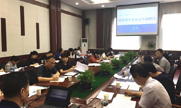 为贯彻落实《教育部关于印发< 普通高等学校师范类专业认证实施办法(暂行)>的通知》文件精神,顺利开展今年会官网师范专业认证工作,7月10日下午,副校长韩权在办公楼会议中心第四会议室主持召开师范专业认证工作会。教务处、学生处、招就处、人事处、计财处、国资处、图书馆负责人,开办师范类专业学院院长、教学副院长、专业负责人等40余人参加了会议。
