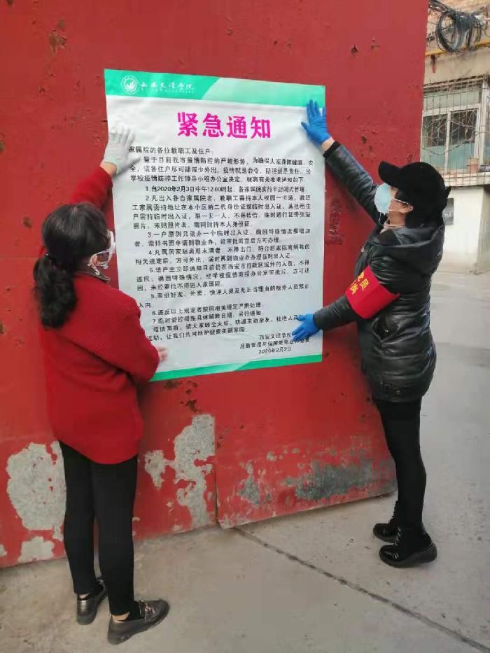 学校疫情防控工作领导小组成员分别赴太白校区、翠华路家属区和关中书院、大皮院、家属区、校医院、食堂、学生公寓、保卫室慰问一线工作人员,具体指导疫情防控工作。要求各级党员干部牢固树立以师生为中心的思想,充分认识当前疫情防控的严峻形势,克服侥幸心理和麻痹思想,排查检测到位,掌握信息精准,报送信息及时,切实把广大师生员工的安全健康放在首位,全力做好个人、家庭、单位协同防控工作,确保疫情防控工作取得实效。