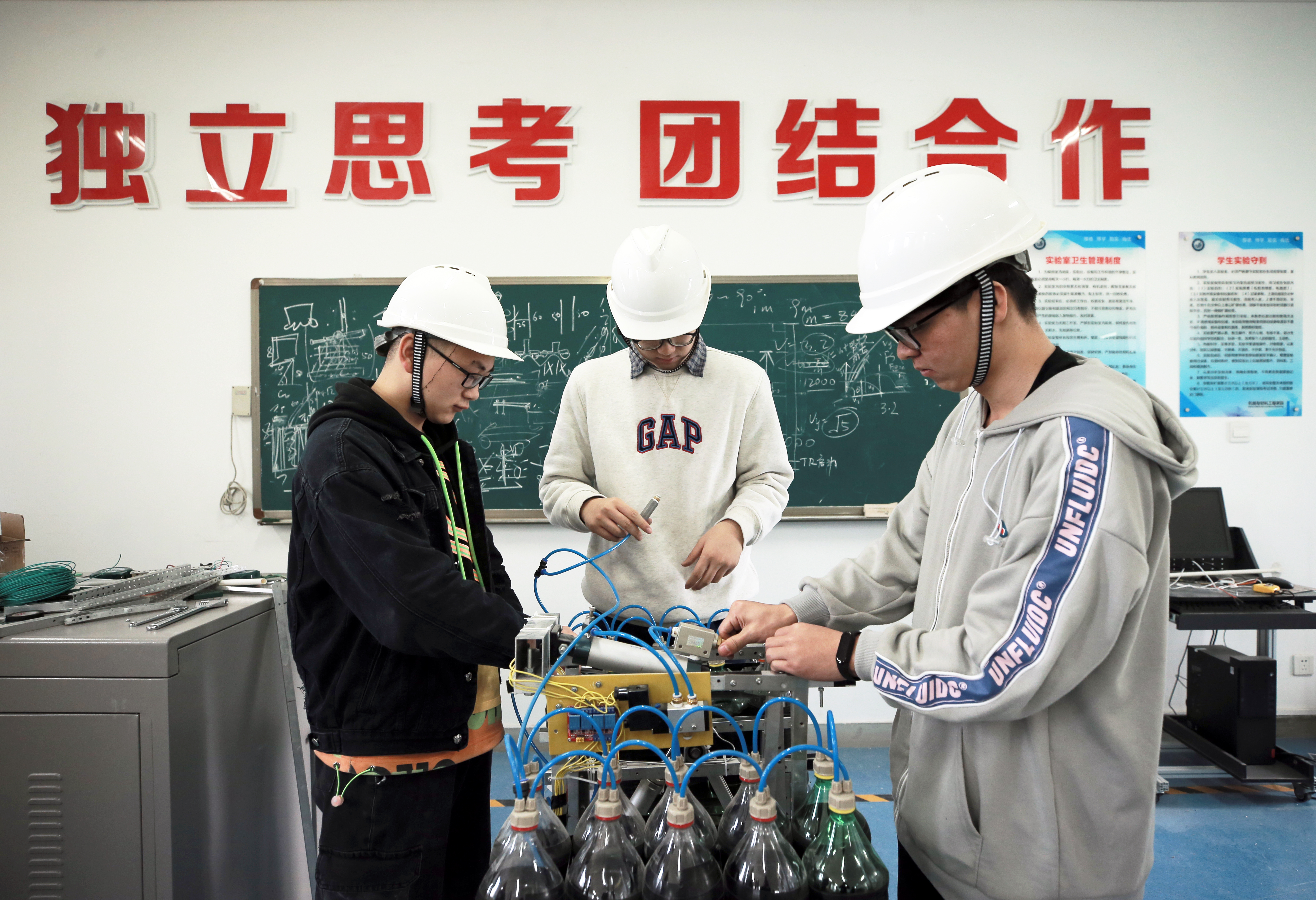 为了打造出最完美的的机器人,小组内常常因为思维方式和技术方案不统一产生“矛盾”,一次次讨论、一次次实验全部推翻,不同意见相互碰撞,不厌其烦地努力寻找最为可行的方案。“行百里者半九十”,越是临近出征,机器越会出现各种不可预期的问题,赛前的紧急调试更需要队员有一颗强大的心脏。在这个并不“高端”的实验室里,AIR(VEX)机器人战队间形成了相同的默契与信念,他们与机器人融为一体,共同心跳。