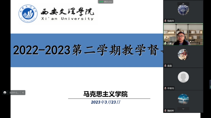 3月23日,马克思主义学院教学质量监控办公室线上召开2022-2023学年第二学期教学督导组第一次工作会议。申亚民教授等5名校内外督导专家,马克思主义学院院长钱晓萍、教学副院长王舵参加会议。