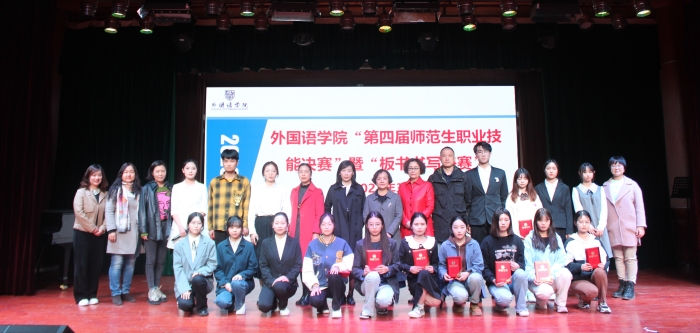 本次大赛自去年4月启动以来,得到了学院领导、老师们的大力支持和同学们的高度关注,先后经过全员参与的初赛和优中选优的复赛,最终13名同学进入职业技能大赛决赛,16名同学进入板书技能大赛决赛。选手们按照“十项教学技能”要求,通过现场提交教学设计、模拟课堂教学,运用其出色的专业知识,结合教材并通过小游戏等环节设计,展示了各自风采。板书技能大赛中,选手根据给定内容,5分钟内完成了中文和英文书写。他们教态自然、语音纯正、思路清晰、表达精炼、书写优良,充分显示了外国语学院英语师范生的教学功底。
