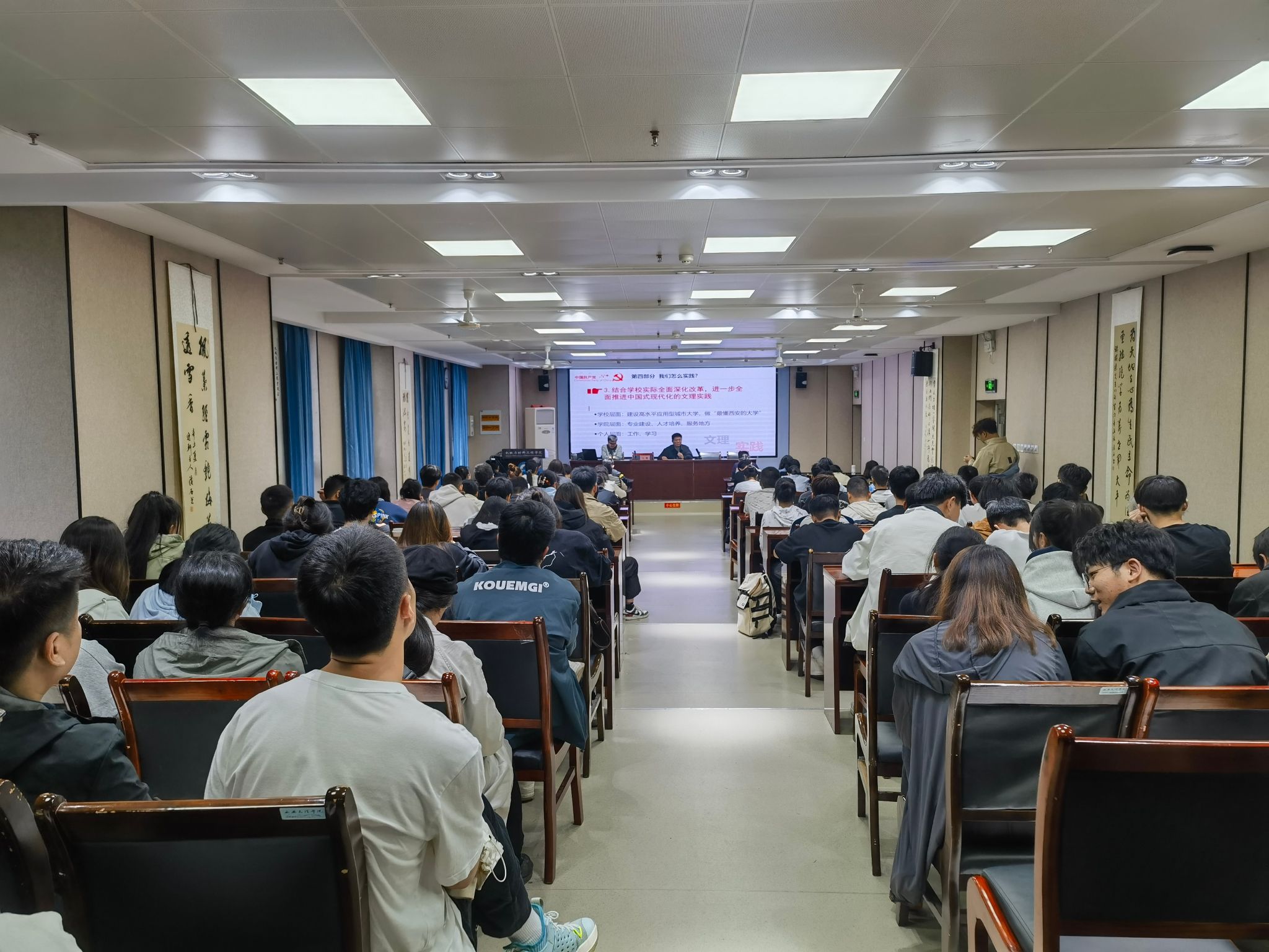 王舵副教授从四个方面对党的二十届三中全会精神进行了宣讲。他首先介绍了全会基本概况,提到全会指出:“要统筹好发展和安全,落实好防范化解房地产、地方政府债务、中小金融机构等重点领域风险的各项举措。要加强舆论引导,有效防范化解意识形态风险。要有效应对外部风险挑战,引领全球治理,主动塑造有利外部环境。”并对此详细解释。第二部阐释了如果看待党的二十届三中全会。着重讲述中国式现代化的逻辑。第三部分享了下一步怎么干,提及应构建支持全面创新体制机制,同时教育、科技、人才是中国式现代化的基础性、战略性支持。必须深入实施科教兴国战略、人才 强国战略、创新驱动战略。第四部分讲述了实践路径,从学校层面展开,提出应结合学校实际全面深化改革,进一步全面推进中国式现代化的文理实践。