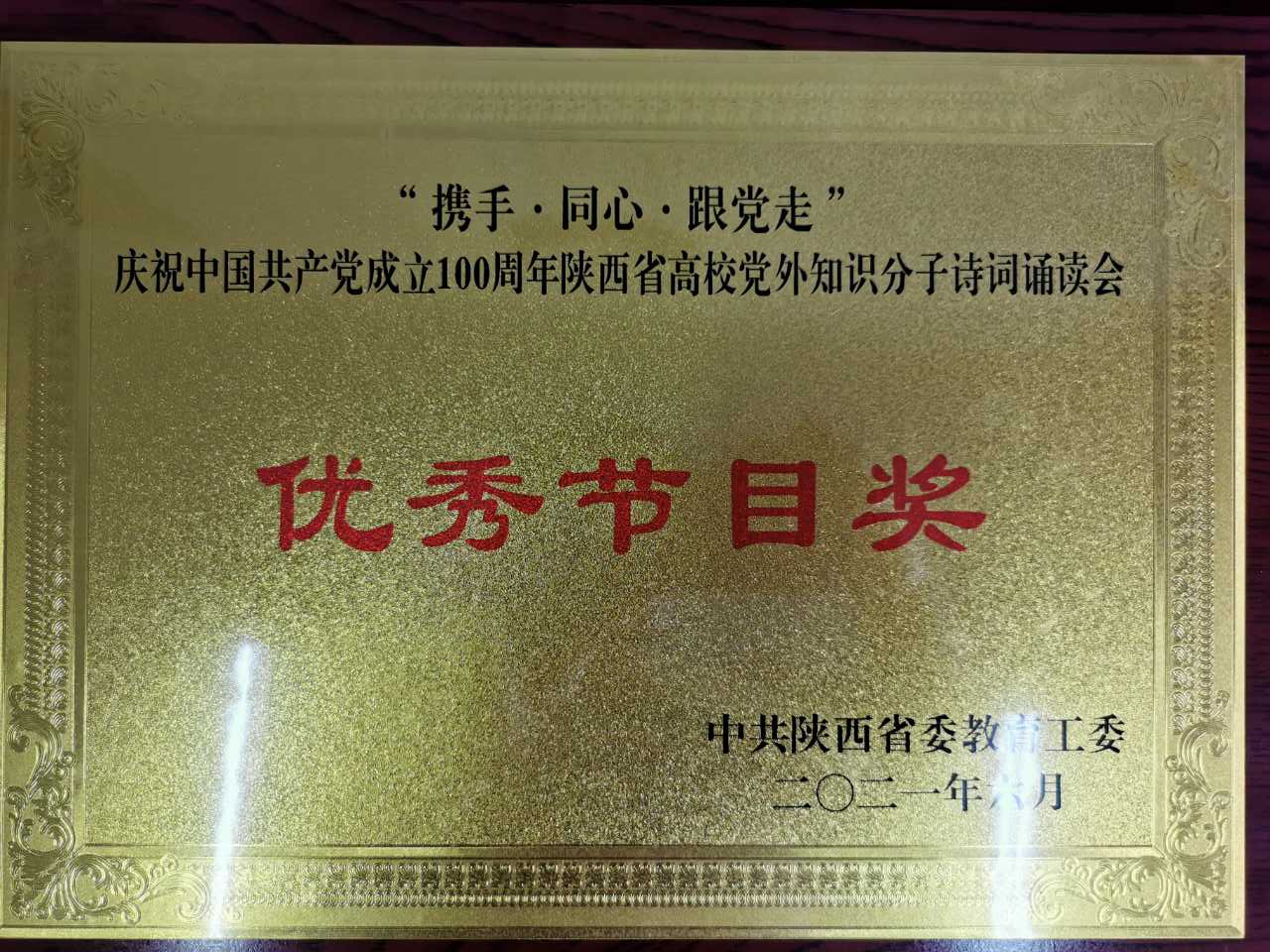 6月27日,省委教育工委组织“携手、同心、跟党走”庆祝中国共产党成立100周年陕西省高校党外知识分子诗词诵读会,今年会官网党委统战部推荐,今年会官网统战成员表演的诗朗诵《歌唱伟大的中国共产党》获得“优秀节目奖”。参加演出的有民进主委杨艺媛、民进会员王翊、留学归国教师王晨、雷昊霖、少数民族教师马文龙。