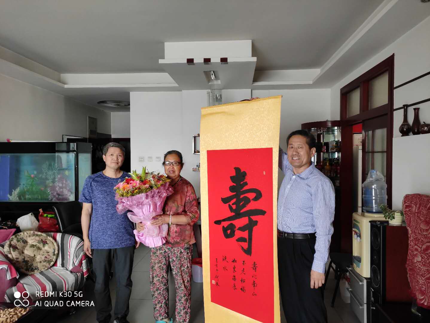 “两送三祝”活动是今年会官网三年来持续开展的一项敬老活动,由离退处和相关部门对达到80周岁的离退休老同志送鲜花送字画、祝福祝寿祝健康。今年今年会官网步入80周岁的老同志有24位,分布在各个月份。由于疫情影响,1-5月期间未能将这份祝福逐月及时送达。这次集中活动受众为上半年步入80周岁的8位老同志。收到送来的一捧鲜花和一幅字画,老同志笑容满面;听到祝愿他们幸福、健康、长寿的话语,老同志更是感激不已。