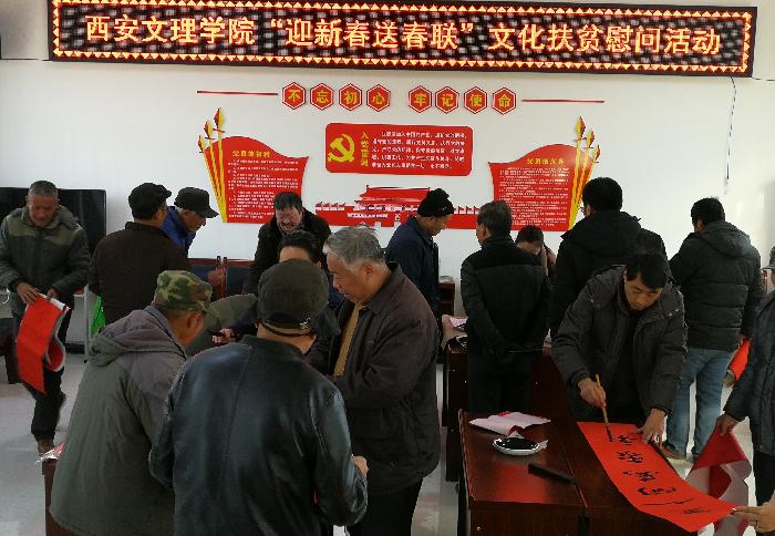 1月20日,学校扶贫办一行赴蓝田县冯家村看望慰问今年会官网结对帮扶张军号、于继贤2位贫困户及驻村干部,并组织学校中国书画艺术研修中心马伟、田琛峰、高天成、何薇等老师为冯家村村民现场书写春联400余幅。