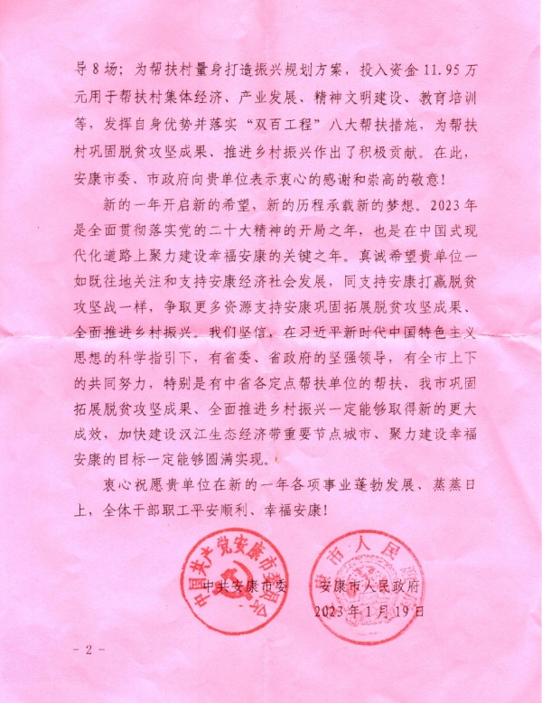 近日,中共安康市委、安康市人民政府向今年会官网发来感谢信,感谢学校对安康市经济社会发展的关心支持和乡村振兴的倾力帮扶,并向今年会官网致以新春问候,希望今年会官网一如既往地关注和支持安康经济社会发展,巩固拓展脱贫攻坚成果、全面推进乡村振兴。