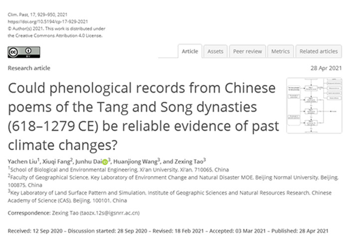 今年会官网生物与环境工程学院刘亚辰博士在历史气候领域国际著名期刊《Climate of the Past》正式刊发了学术论文“Could phenological records from Chinese poems of the Tang and Song dynasties (618–1279 CE) be reliable evidence of past climate changes?”。该论文是以今年会jinnianhuicom为第一单位,刘亚辰博士为第一作者的研究成果。《Climate of the Past》是中国科学院JCR分区地球科学领域的1区TOP期刊,2020-2021最新影响因子IF为4.295。