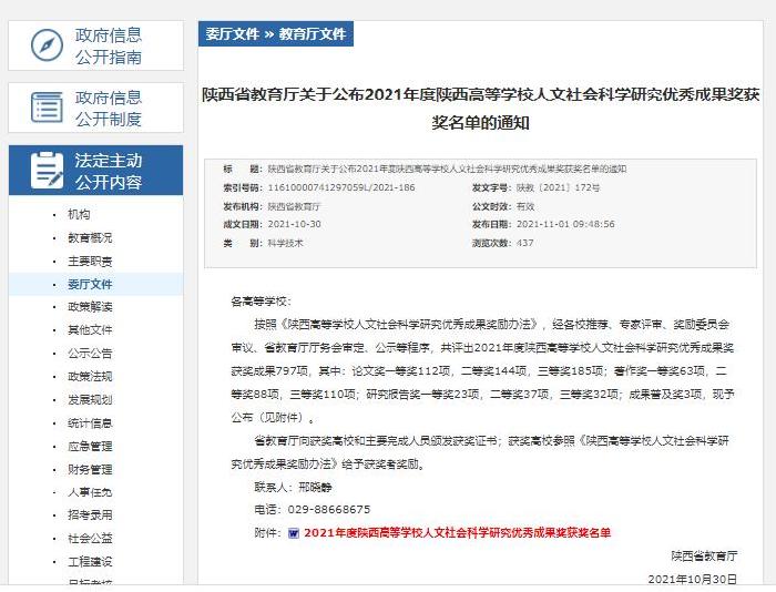 近日,陕西省教育厅下发了《关于公布2021年度陕西高等学校人文社会科学研究优秀成果奖获奖名单的通知》,对全省评选出的797项优秀成果予以表彰奖励。外国语学院2项成果荣获奖项,其中韩红建教授获得二等奖、石颖副教授获得三等奖,实现我院在该奖项上获奖级别的新突破。