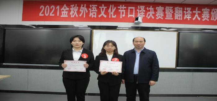 11月10日, 2021金秋外语文化节系列活动之“美美与共,‘译’展风采”口译决赛暨翻译大赛颁奖仪式在实训楼举办,此项赛事由外国语学院翻译系承办。经过初赛,来自外国语学院、信工学院、师范学院和经管学院的12选手入围口译决赛。院长韩红建、副院长杨红梅、李征娅、姚金红出席了本次活动。
