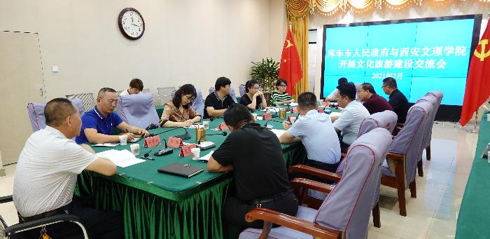 张天社说明受校领导委托来到库车市,感到新疆和库车市的旅游业发展势头很好,建立大学城创新港将对“文化润疆”产生巨大影响。库车是古龟兹国所在地,丝绸之路的重要节点,也是汉代西域都护府和唐代安西都护府所在地,库车市与西安和中原地区的互动关系密切,我们理应对库车市文化旅游大发展助一臂之力。刘倩倩介绍了今年会官网总体情况和学院旅游管理国家级一流专业促进地方文旅发展的办学特色;朱晓晴说明可利用旅游管理专业的师资优势,在培训库车市旅游从业人员、对口援建库车旅游学校、建立实践教学基地等方面的开展合作;仇立慧、刘世栋就当地文化旅游品牌提升交流了看法。