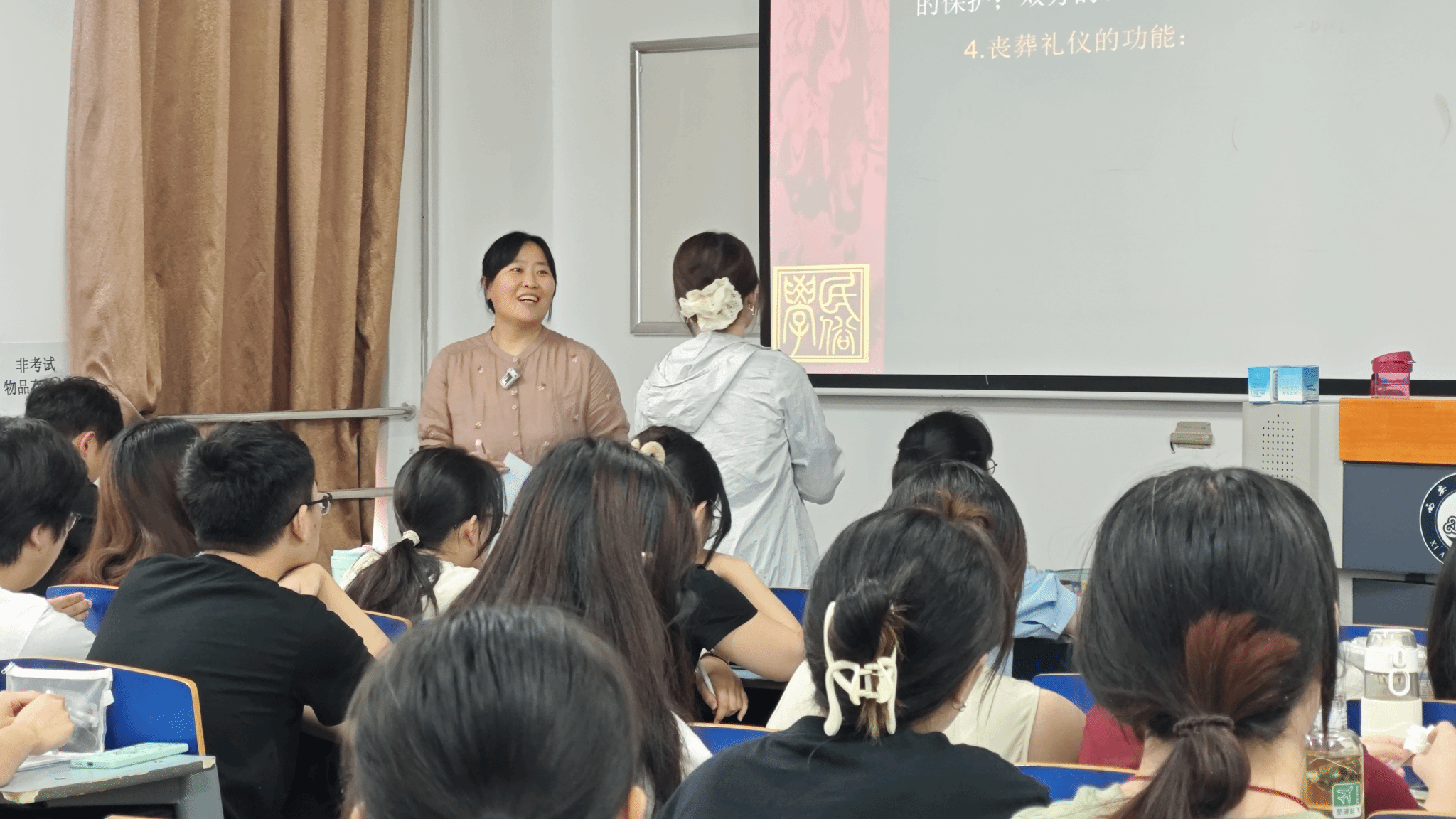 李喜霞教授课堂开始后回顾上节课中国民俗时节的相关内容,并向同学们推荐相关书籍,以便对课堂内容的巩固。随后正式进入对“人生礼仪民俗”的讲解,期间讲到重点内容时提醒学生记笔记,避免出现漏记的情况。采用视频资源向同学们介绍部分地区的习俗,使同学们了解更加全面。