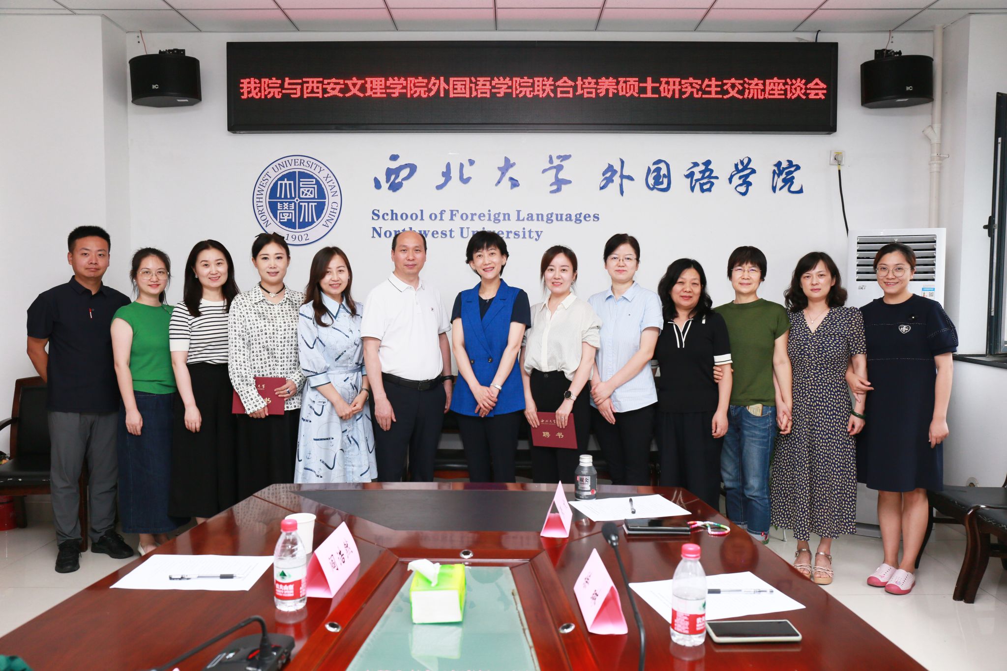 西北大学外国语学院MTI中心主任何花、英语系主任李铁及MTI专业导师等一同参会;曹若男院长及何花主任为学院熊国芳、倪博、长孙馥蓉和赵娟四位新聘任的硕士研究生校外联合培养导师颁发聘书;双方导师就即将开启的翻译硕士研究生联培合作中的细节问题,进行了深入的研讨和交流。