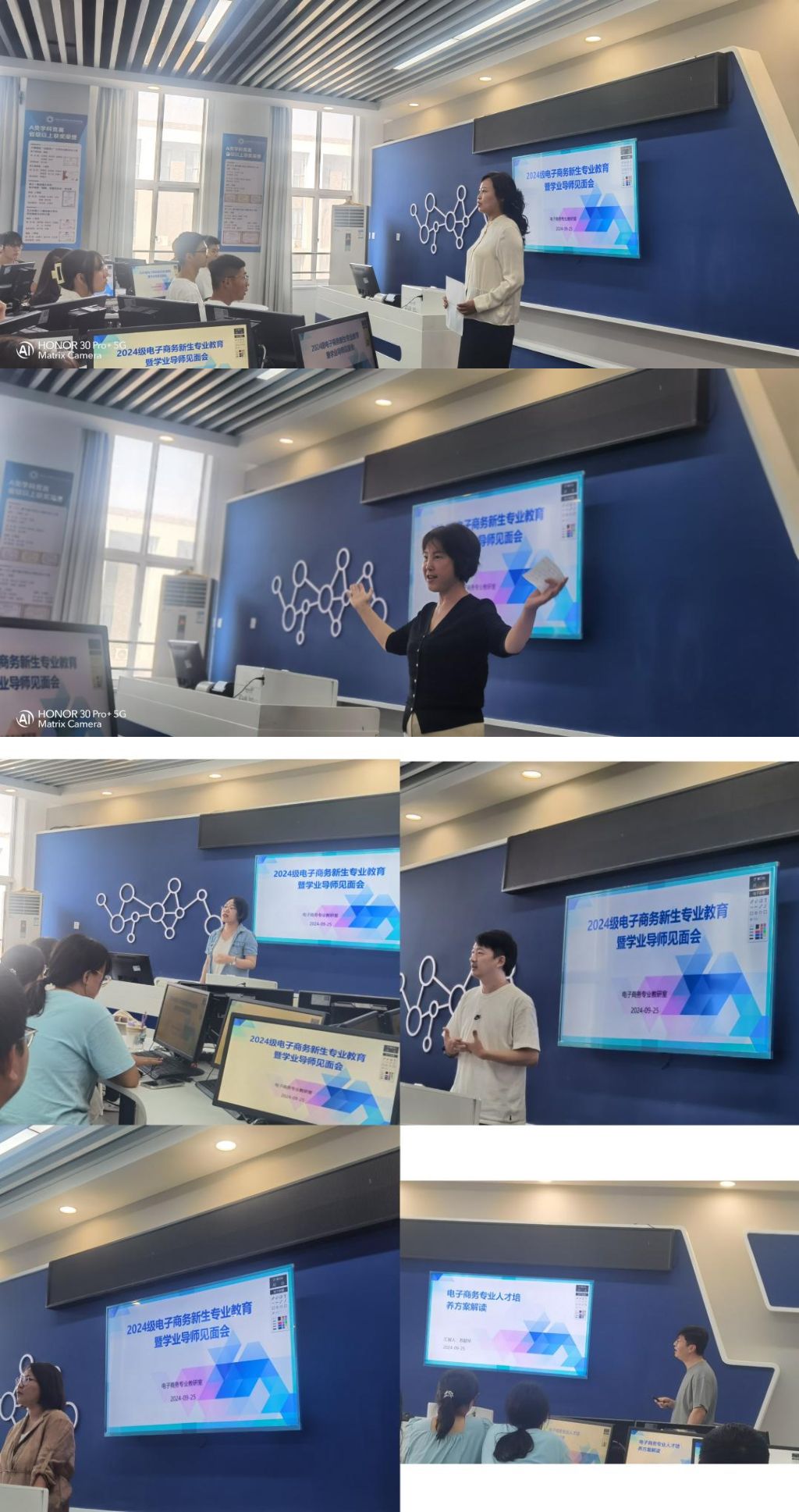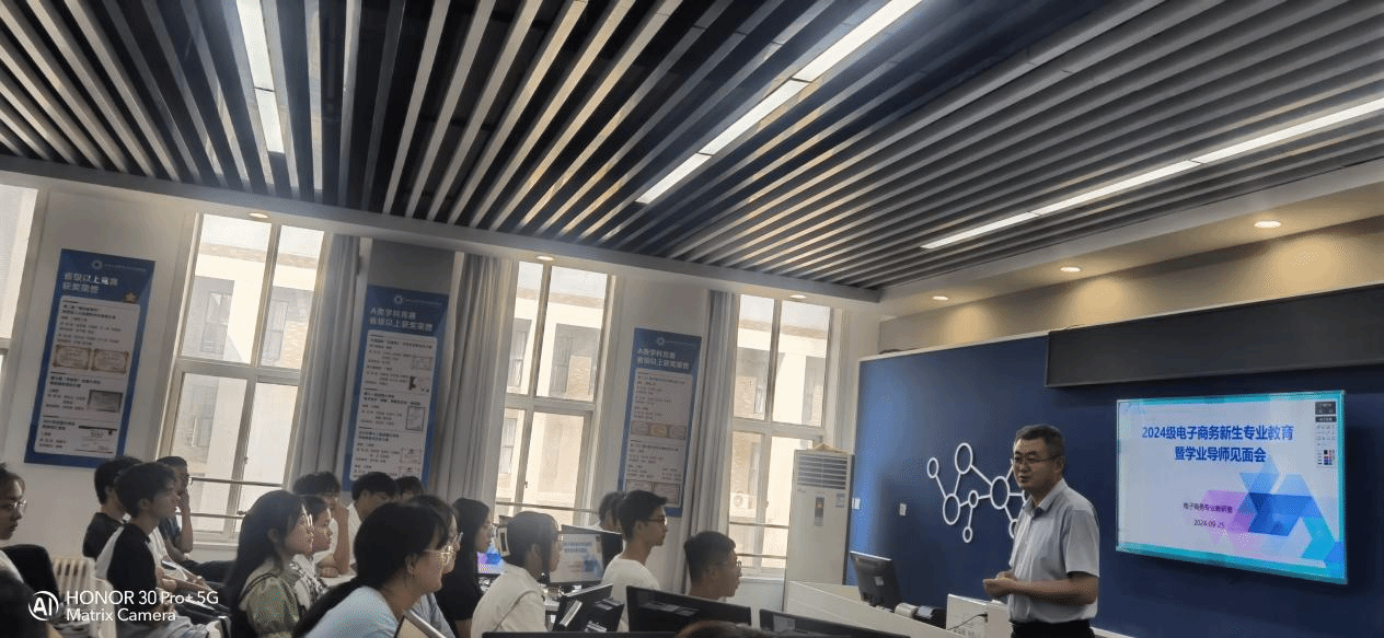 为进一步加强2024级电子商务专业新生的专业认知,帮助新生尽快适应大学生活,有效开展专业学习及规划,在学院统一部署和安排下,电子商务教研室精心组织,于9月25日下午在专业多功能实训室B0420开展了新生专业教育活动暨学业导师见面会。经济管理学院院长闫荣国,副院长贺志武、张彤璞,电子商务专业全体专任教师参与此次活动,活动由电子商务专业教研室主任潘雨相副教授主持。