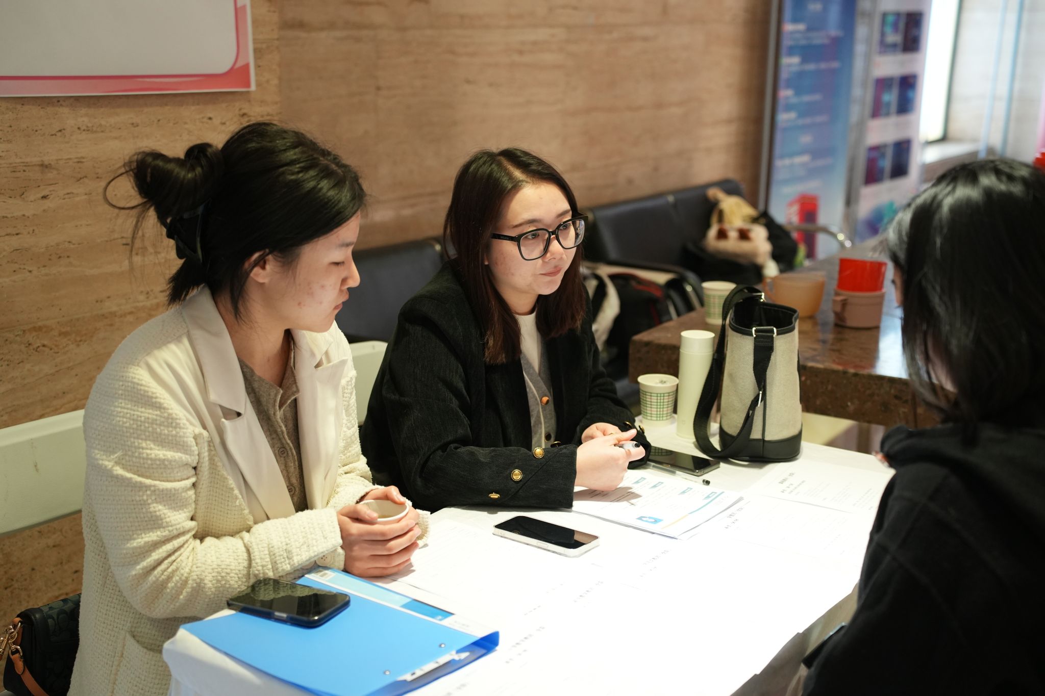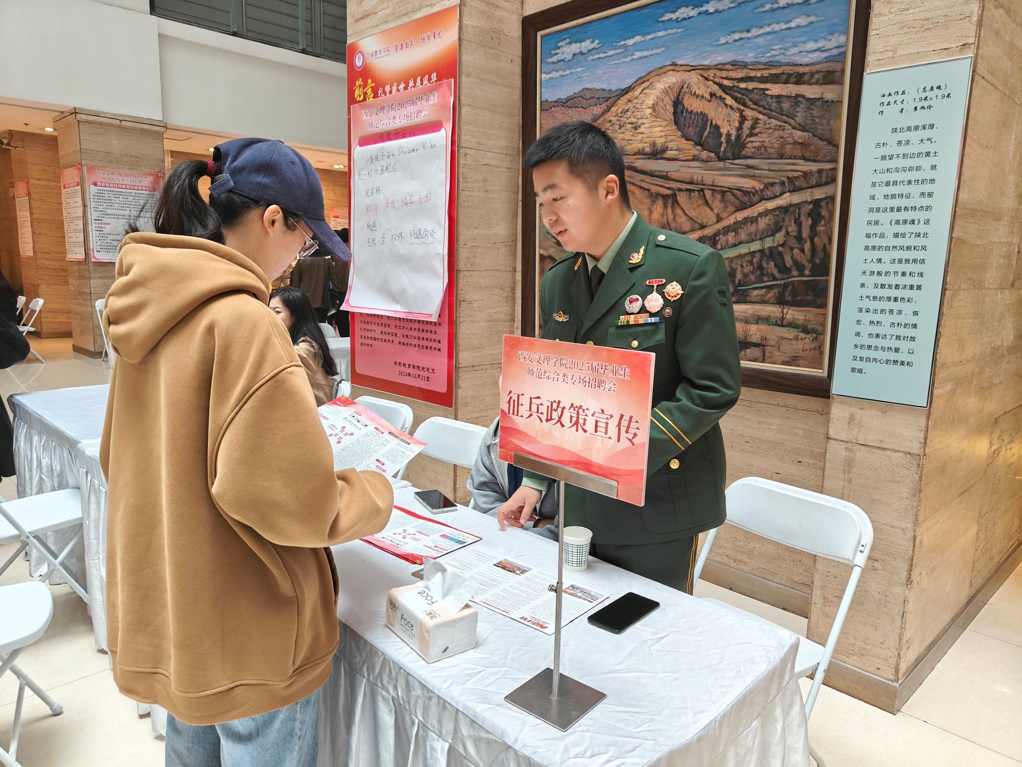 同时,招聘会现场还设置了包括“征兵宣传”、“简历门诊”等在内的多个功能区,为毕业生同学们提供全方位的招聘会服务。在“征兵宣传”专区,今年会官网优秀退伍学生手持征兵政策宣传手册,为有意征兵入伍的同学,介绍入伍政策和发展前景,让毕业生同学深入了解不同就业渠道。