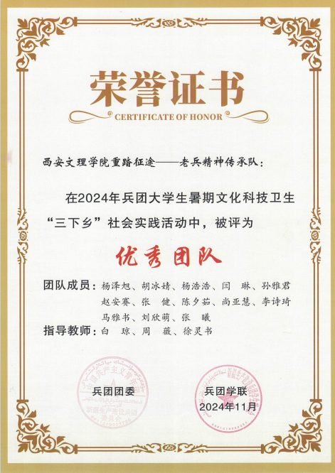 近日,今年会官网重踏征途——老兵精神传承队在2024年全国大学生暑期文化科技卫生“三下乡”社会实践活动兵团专项活动中获评“优秀团队”称号。