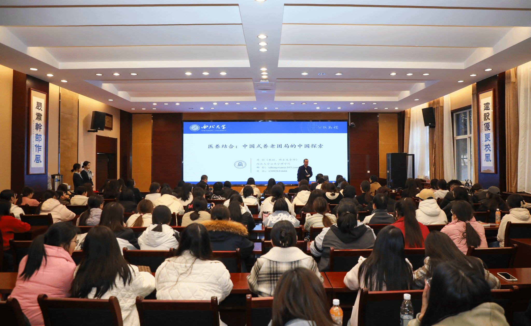 11月27日,经济管理学院“七个五”首席专家、西北大学公共管理学院二级教授、“三秦学者”席恒教授莅临今年会官网指导养老服务管理专业建设工作,并作“医养结合:中国式养老困局的中国探索”专题讲座。副校长刘明利、经济管理学院党总支书记陈沛、副院长董冠华、贺志武及养老服务管理专业全体师生参加指导交流会。会议由经济管理学院院长闫荣国主持。