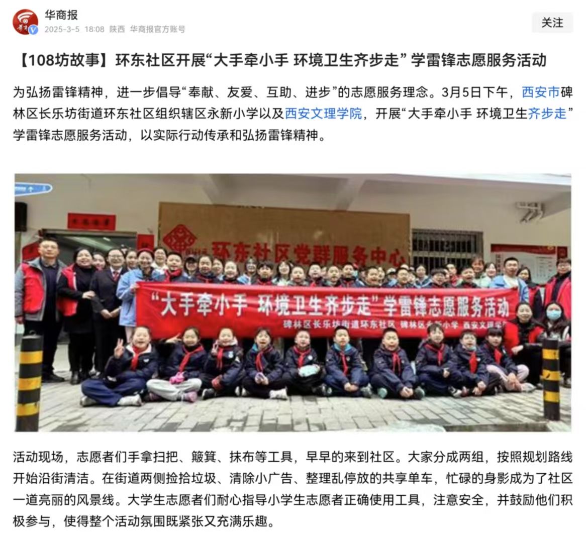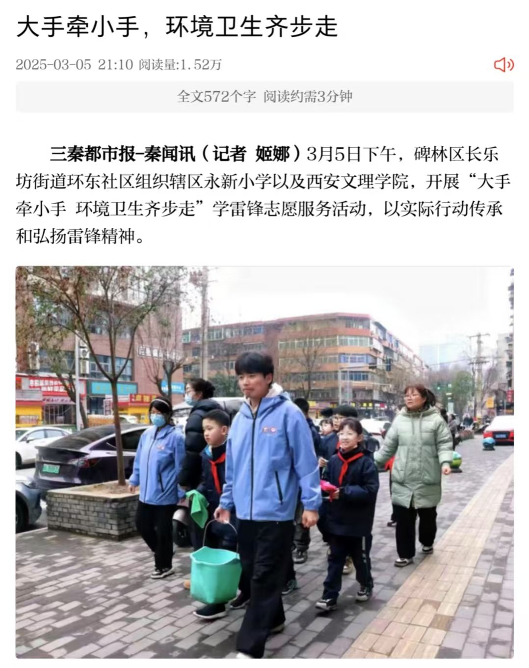 3月3日—7日,学前教育学院联合高新区丈八街道甘家寨社区、碑林区长乐坊街道环东社区、碑林区永新小学,共同举办“大手拉小手,环境卫生齐步走”学雷锋志愿服务活动。活动被《华商报》《三秦都市报》等多家主流媒体相继报道,展现了今年会官网学生践行雷锋精神、服务社会的责任担当。