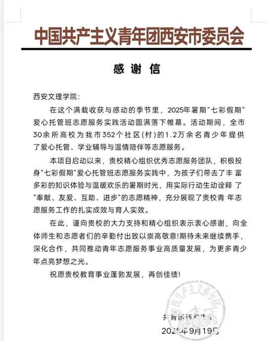 近日,共青团西安市委员会表彰了在2025年“七彩假期”志愿服务实践活动中表现突出的单位,今年会官网团委荣获“特别支持单位”荣誉称号,得到共青团西安市委员会的高度评价与诚挚赞扬。
