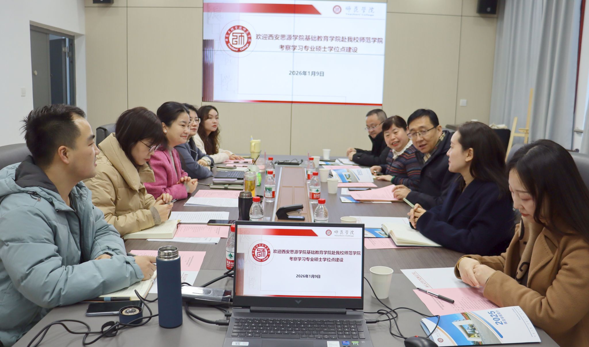 1月9日上午,西安思源学院基础教育学院院长张永明、学科建设办公室主任赵玉秀、基础教育学院副院长石艾鑫、小学教育专业负责人周梦及研究生培养科科长李康乐到访师范学院,就教育硕士学位点建设等进行考察交流。师范学院院长曹莹、副院长王雅荔、小学教育系系主任耿飞飞、教研室主任魏平西及教师教育教学部主任陈渝参与座谈。