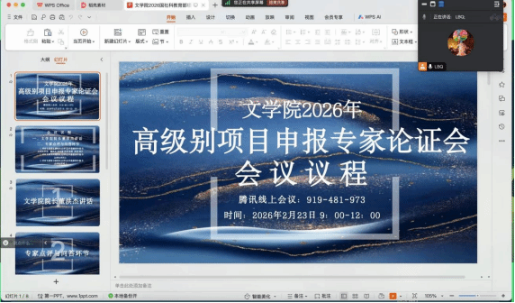 为进一步优化提升高级别项目申报质量,2月23日至24日,文学院举办寒假第二轮高级别项目线上专家论证会。黄忠廉、李西建、钟书林三位专家第二次受邀参与指导论证,学院申报团队成员参会,党总支委员李冰清主持。