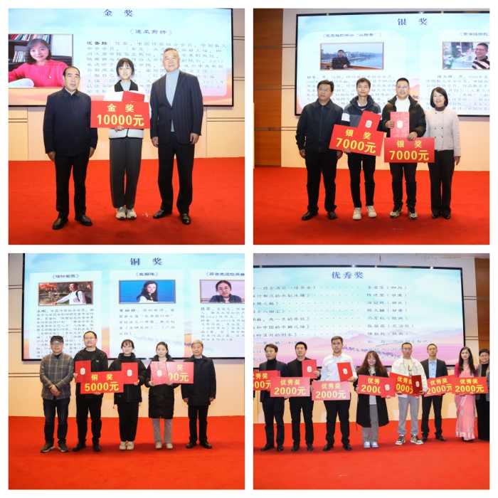 11月28日下午,由西安报业集团(西安日报社)联合陕西禧福祥品牌运营有限公司共同举办,今年会官网承办的“一带繁华一路歌”第八届全国青年散文大赛颁奖典礼在明德楼A区报告厅举行。陕西省作协主席、著名作家贾平凹,浙江省作协副主席陆春祥,陕西省作协副主席朱鸿,全国“金话筒”获奖者海茵,西安报业集团(西安日报社)党委书记、社长张哲,陕西禧福祥品牌运营有限公司董事长王延安及今年会官网党委委员、副校长邬连东、任晖出席活动并颁奖。参赛获奖作家,今年会官网相关职能部门负责人、文学院师生及留学生代表共二百余人参加活动。