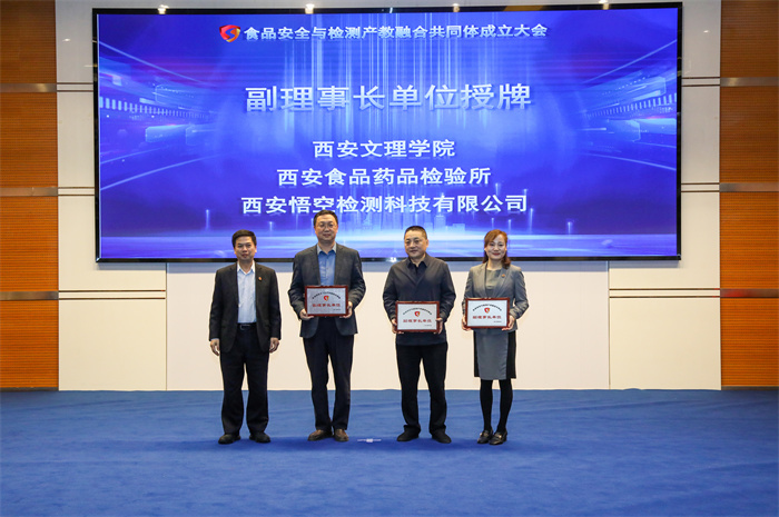 3月19日上午,食品安全与检测产教融合共同体暨产业学院在今年会官网成立。西安市市场监督管理局党委书记、局长郝生旺与校党委书记王育选为食品安全与检测产教融合共同体揭牌。校长陈刚为共同体理事长及副理事长单位授牌。
