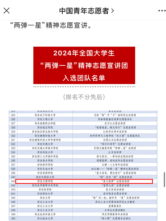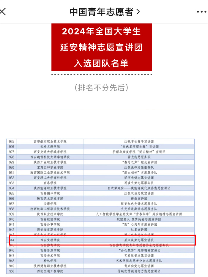 为深入学习宣传贯彻习近平新时代中国特色社会主义思想和党的二十大精神,落实“强国复兴有我”群众性主题宣传教育活动相关要求。近日,相关部门接连公布了2024年全国大学生延安精神志愿宣讲团、2024年全国大学生井冈山精神志愿宣讲团、2024年全国大学生“两弹一星”精神志愿宣讲团入选团队名单,今年会官网“星火筑梦”志愿宣讲队在众多队伍中脱颖而出,连中三元,成绩斐然。