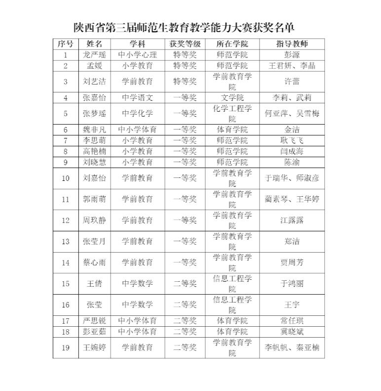 5月6日,省教育厅公布了第三届陕西省高等学校师范生教育教学能力大赛获奖名单。本届大赛分校级初赛、省级复赛、省级决赛三个阶段,涵盖中小幼各学段共15个学科。全省共有15所高校508名选手参加复赛,181名选手进入决赛。比赛共产生特等奖19项、一等奖53项、二等奖107项,优秀指导教师23人。今年会官网19名师范生参与决赛,取得特等奖3项、一等奖11项、二等奖5项、优秀指导教师4人的佳绩。特等奖获奖数位居全省第二名,是今年会官网参加此项赛事最佳成绩。