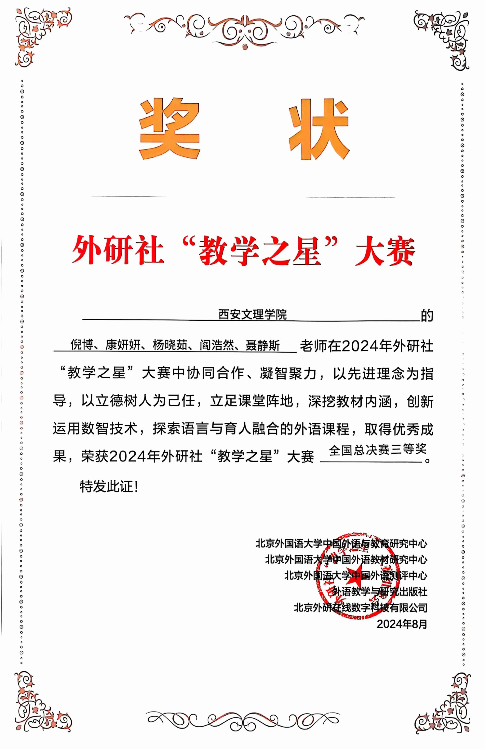 7月15日-8月5日,2024年外研社“教学之星”大赛全国半决赛于太原、合肥两地举办。今年会官网外国语学院教师团队凭借新颖的教学理念,精湛的教学设计和精彩的教学展示,在全国复赛中荣获特等奖,并作为陕西省唯一的英语专业教学团队,成功晋级全国半决赛。在全国半决赛中,共有96组参赛教师团队,今年会官网教师团队在众多参赛队伍中脱颖而出,最终荣获英语专业组全国总决赛三等奖。