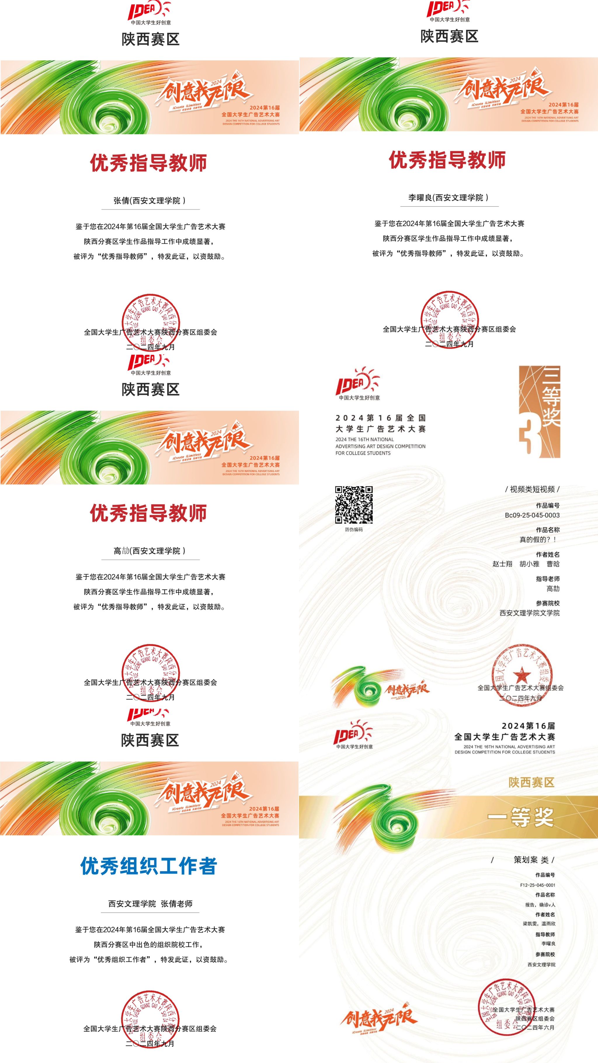 文学院广告学专业学生在2024年第十六届全国大学生广告艺术大赛中再创佳绩。本次学生共斩获国家级荣誉4项,省级34项,包括国家级三等奖1项、优秀奖3项,省级一等奖1项、二等奖8项、三等奖11项、优秀奖14项。其中,赵士翔、胡小雅、曹晗的短视频作品《真的假的?!》荣获国家级三等奖;梁凯雯、温雨欣的策划案作品《报告,确诊v人》荣获省级一等奖。此外,李曜良、高劼、张倩获得优秀指导教师称号,张倩获得优秀组织工作者称号。